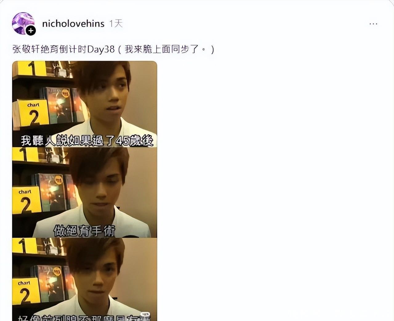 绝育倒计时启动粉丝玩梗玩到“上头”轩公懵了“张敬轩绝育倒数Day38” 这几天Threads被这条帖子刷屏起因竟是他即将在2026年2月1日迎来45岁生日。粉丝们翻出他17年前的“豪言壮语”开启了这场啼笑皆非的“倒计时”——