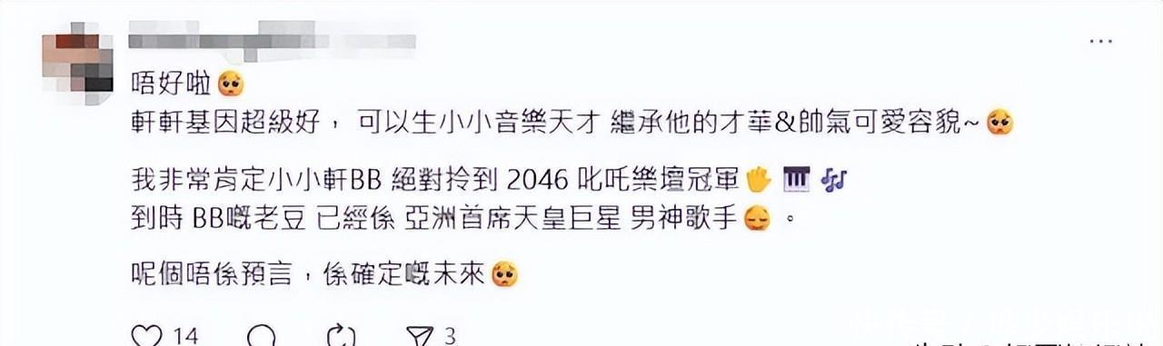 粉丝分裂现场一派“刀下留人”一派“笑到劈叉”这场“绝育狂欢”里粉丝群体彻底分裂成两大阵营画风截然不同“优生学”派小轩轩必须出生“唔好啦轩轩基因超级好可以生个小轩轩继承佢嘅音乐才华同靓仔样” 这派粉丝高举“刀下留人”大旗甚至脑补出“小轩BB”的未来“我肯定小轩BB绝对拎到2046叱咤乐坛冠军”“轩公的情歌后继有人了” 更有人翻出张敬轩父亲曾是粤剧演员的旧照强调“基因强大论”“看看轩公老窦70岁还能唱大戏轩公肯定能打破‘45岁绝育’魔咒”